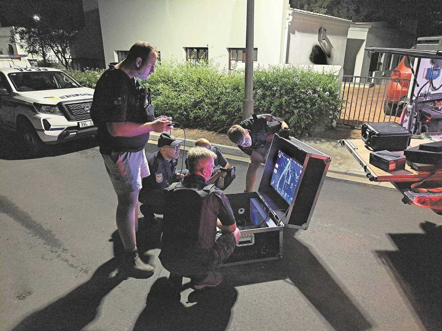 Die buurtwag se hommeltuigspan, bestaande uit vier lede in die buurtwag se lugvleuel, het sowat 300 m van elke teikenarea af stelling ingeneem en die hommeltuig vir ’n verkenningsvlug opgestuur. Nadat die teikengebeid met die hommeltuig se nagsigkamera verken is, het die polisielede inbeweeg.