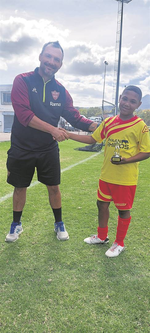 Die talentvolle Draytine Davids van Cloetesville-sokkerklub het ook die toekenning vir Speler van die Toernooi verower. Regs ontvang hy sy trofee van Morne Crumpton, junior koördineerder van Stellenbosch FC.