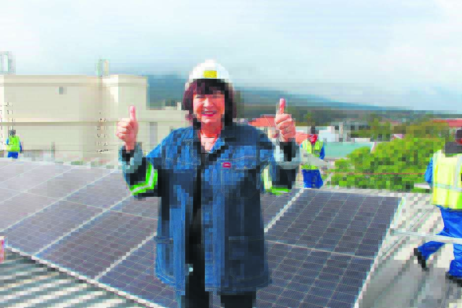 Mayor Gesie at the installation of solar panels on the Stellenbosch Town Hall roof and administration building earlier this year. Foto: