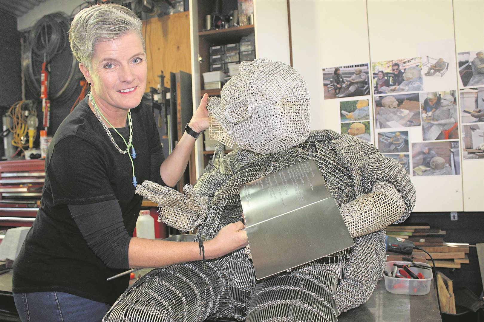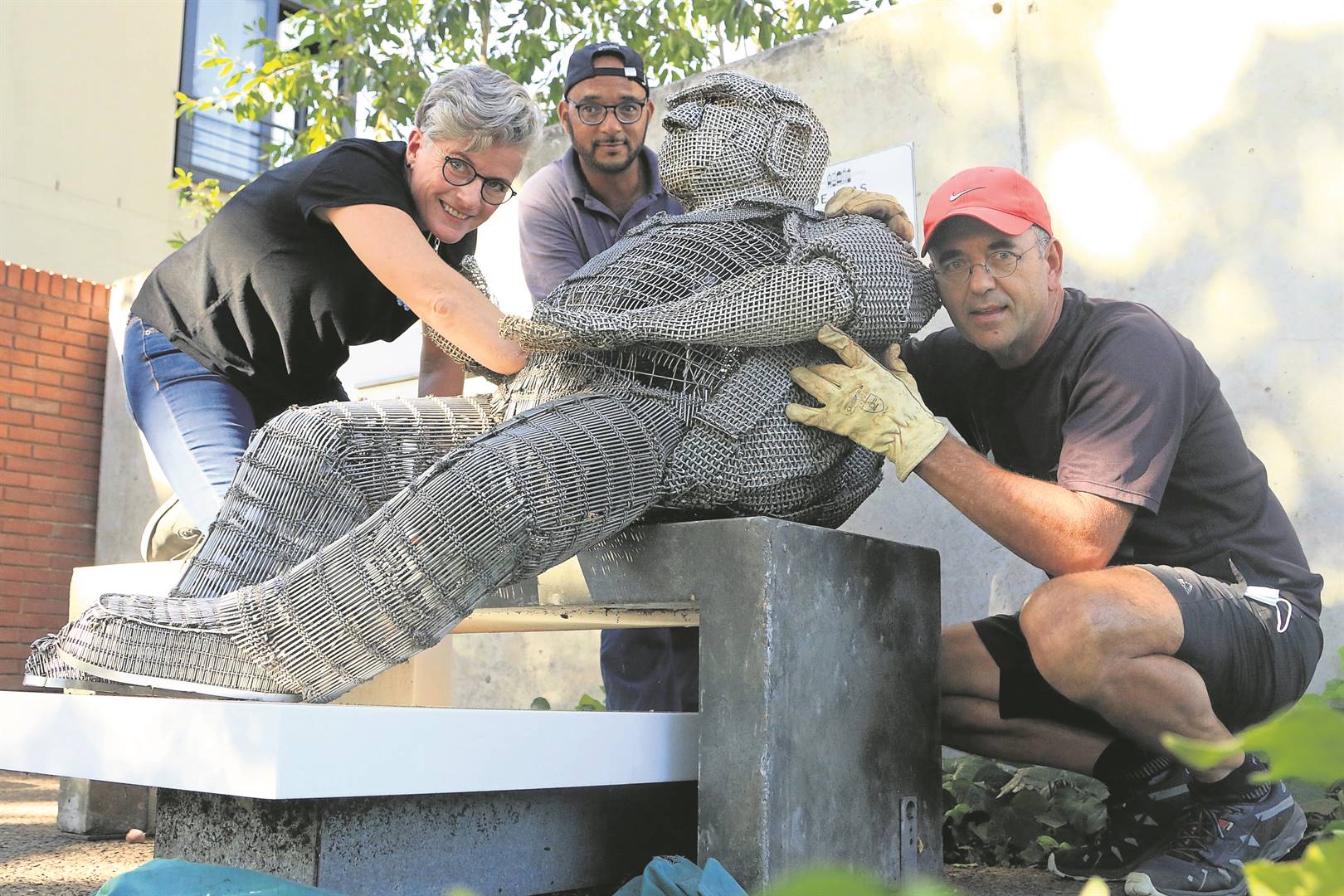 Die Laan se bekendste inwoner, Oupa Carlos, is Vrydag 4 Maart voor De Haas Living-gastehuis kom haal nadat hy weer onder vandale deurgeloop het. Volgens Jean Louw, die kunstenaar wat Oupa Carlos as deel van haar Seemingly Peaceful-1-beeldbouwerk geskep het, is hy erg beskadig. “Hy is met ’n ystersaaglem gesaag om ’n swak plek te maak in die vlekvryestaal- staaf wat Oupa se boek aan sy lyf verbind. Die boek, sy hande, sy maag, alles is gebreek.” Oupa Carlos is vir tyd en wyl na Jean se studio geneem om reggemaak te word. Saam met Jean Louw (links) is Nigel Palanyadi (middel) en Wilhelm Louw (regs). Foto: Francois Lombard