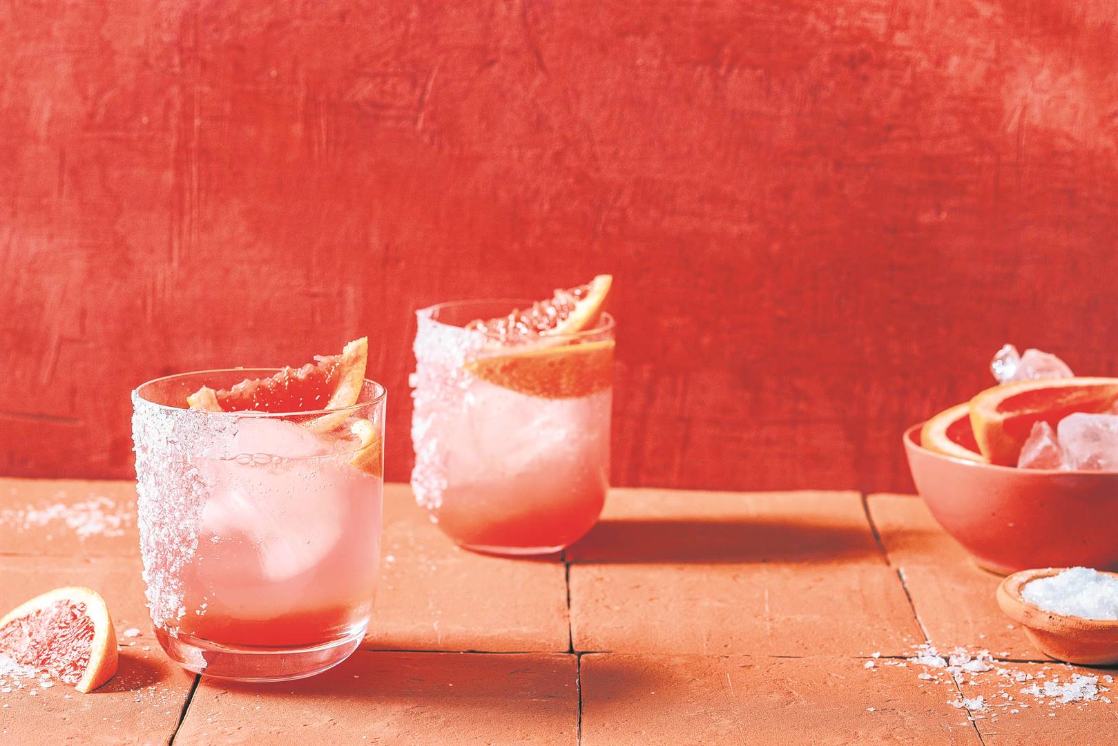 2. For the cocktail: Rub half the outer rim of a cocktail glass with a slice of lime and dip the glass in the sea salt. In a cocktail shaker, combine the tequila, grapefruit juice and syrup. Add the ice cubes and shake for about 15 seconds until the outside of the shaker gets cold and frosty. Strain into the glass, top up with grapefruit tonic and garnish with a grapefruit slice or two.