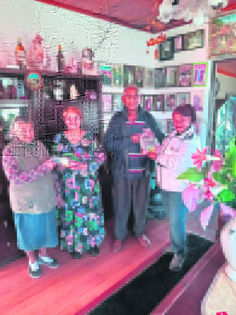 Matilda le Roux, Magdalene September, Hendrik September en Gereldine Muller was byderhand om die handgemaakte produkte aan lede van die Kylemore-gemeenskap vir Mandela-dag te oorhandig.