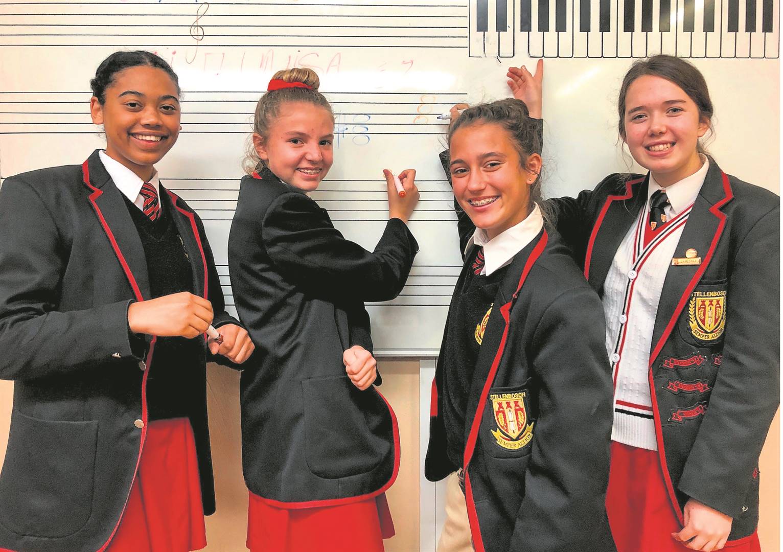 Hierdie leerders van die Hoërskool Stellenbosch is op Unisa se ererol geplaas vir hul uitstekende uitslae in die musiekteorie-eksamen wat in Oktober 2018 afgelê is. Van links is Zoë Samuels (gr. 1: 97%), Franci van der Merwe (gr. 2: 98%), Lian Bell (gr. 1: 97%) en Lize du Toit (gr. 5: 94%).