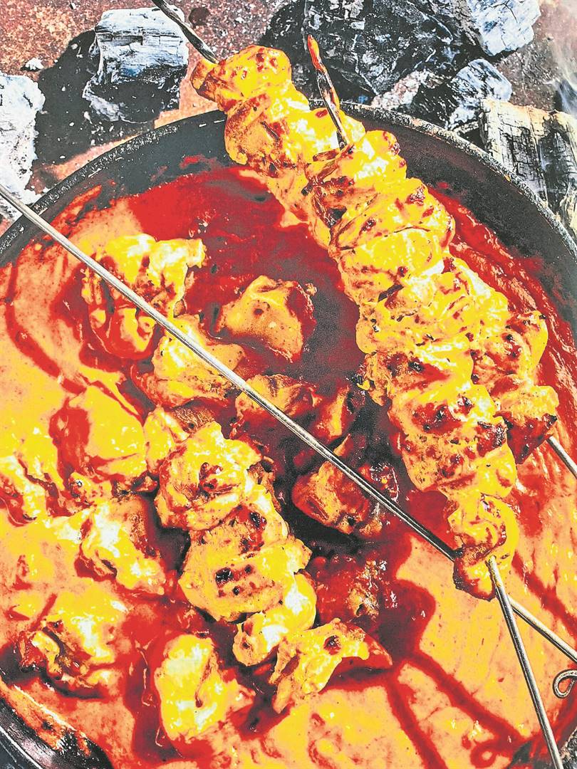 5. Ryg die hoenderstukkies op die sosatiepenne en krap die marinade wat oor is by die pruttende potjie. Braai die sosaties oor medium warm kole vir sowat 10 minute. ’n Swart kolletjie hier en daar is doodreg – dis net gekarameliseer.