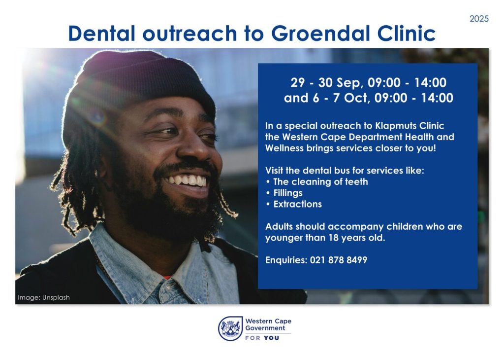 Residents of Groendal and Klapmuts can look forward to outreaches by the department in the coming weeks. The dental outreach bus will visit Groendal Clinic from 09:00 to 14:00 on Monday 29 and Tuesday 30 September, as well as on Monday 6 and Tuesday 7 October.