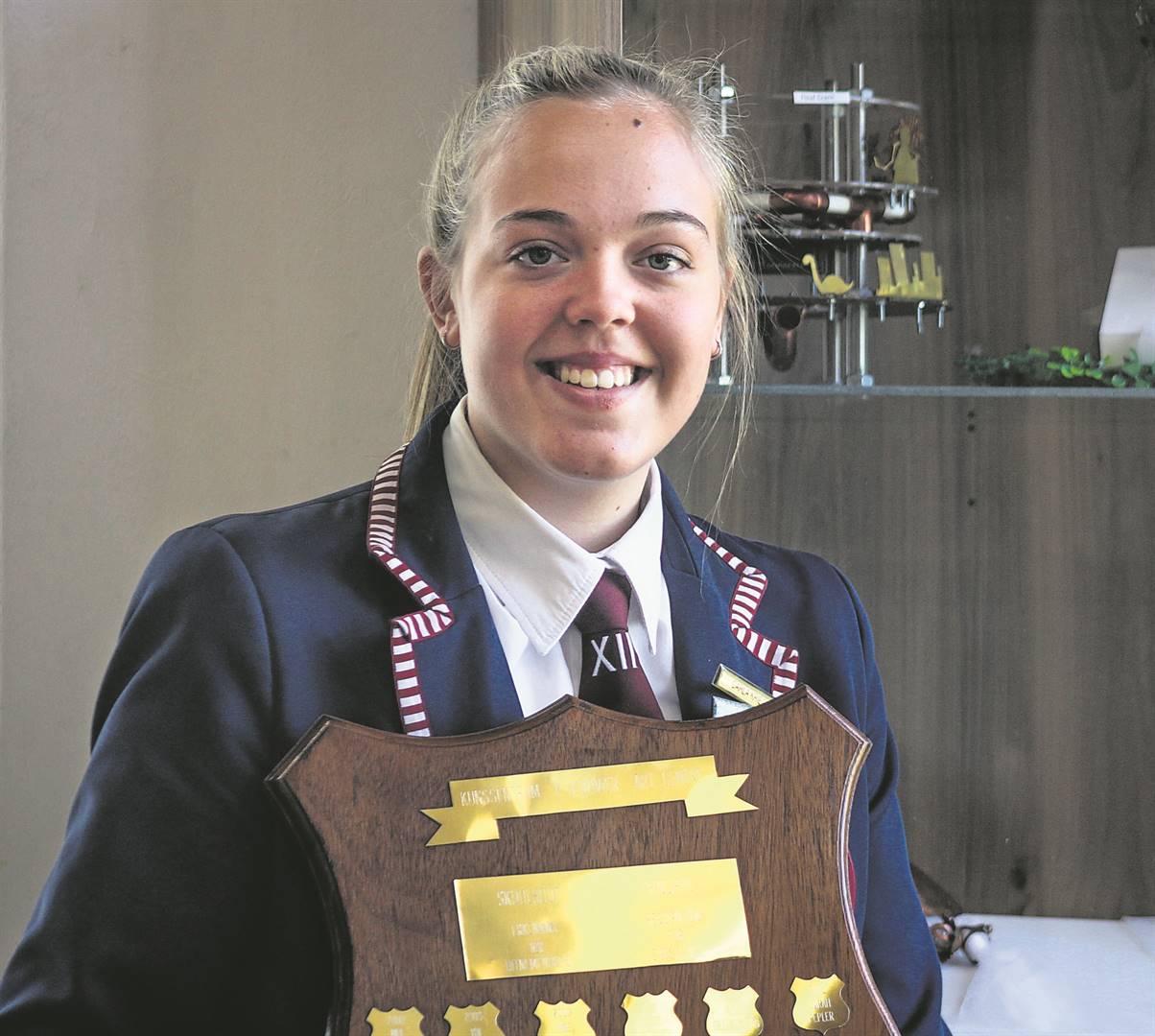 Carla Krieg, ’n matriekleerder aan die Hoër Meisieskool Bloemhof, is vanjaar die ontvanger van die PJ Olivier-kunssentrum se prinsipaal-skild vir uitnemendheid. Sedert gr. 10 handhaaf Carla ’n buitengewoon hoë standaard van werksetiek en het ’n volwasse, tegniese vaardigheid met haar laaste praktiese uitstalling getoon. Met juweliersontwerp as dissipline en “Verwondering” as tema het Carla ’n kroon en skild vir haar laaste praktiese eksamen geskep.Foto: Stephan Meyer