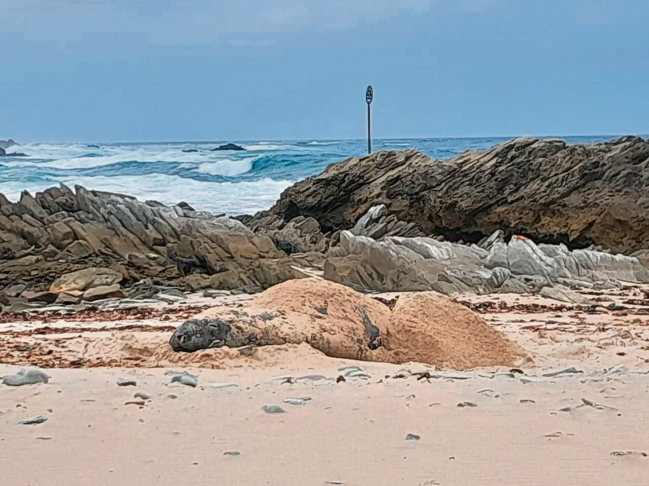 Beachgoers Karla Moore, Iloné Marais and Johan Viljoen were on their way to swim at Blougat when they were met with this unexpected sight. “We were heading down to the beach when we suddenly noticed danger tape. Curious, we peeked over the dune and were completely shocked to see a massive seal resting there!” said Moore.