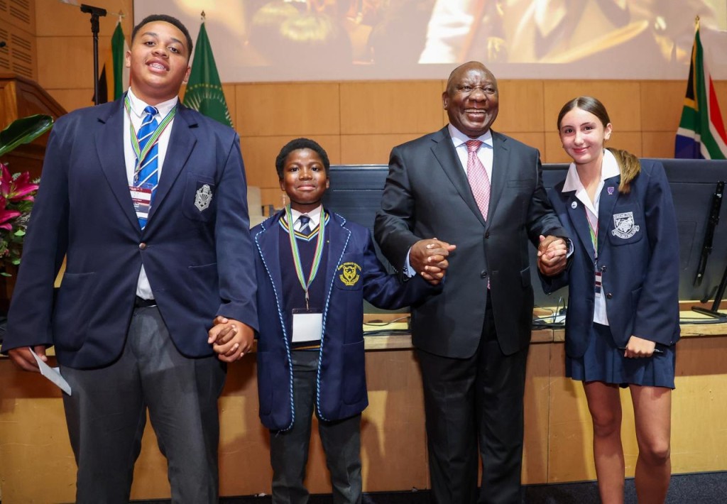 President Cyril Ramaphosa with (from left) Christopher Coetzee-Mbete (Parel Vallei High School, Grade 10), Abenathi Ntshotsho (Ikaya Primary School, Grade 7) and Daniella Takis (Rhenish Girls’ High School, Grade 9). The learners reading of the Preamble to the Constitution in Afrikaans, isiXhosa and English, respectively.