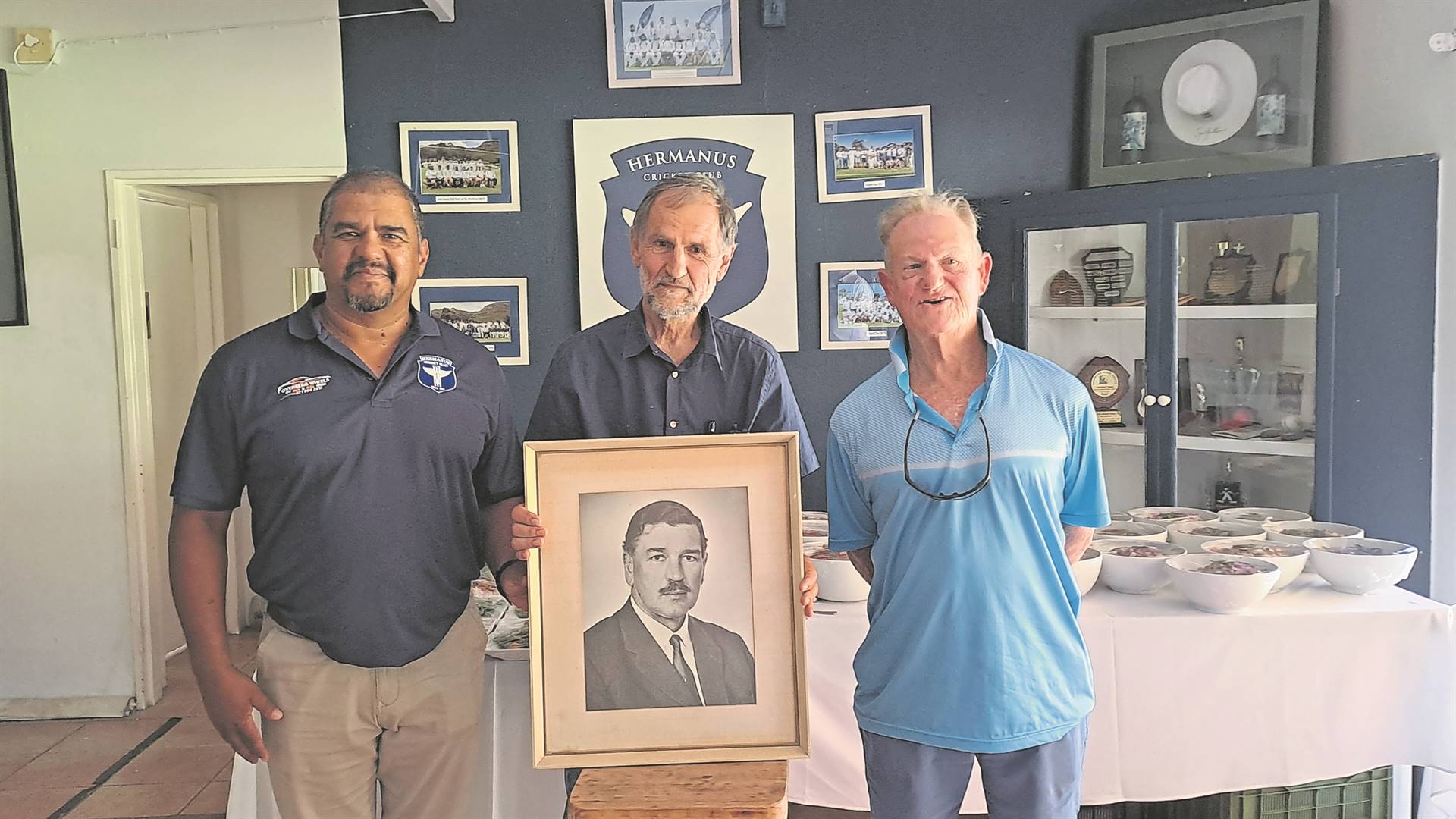 Johan Graaff (middle) with a photo of his father, Sir De Villiers Graaff, who organised the first Graaff Day cricket tournament in 1953. With him are Johan Clarke, chairperson of the Hermanus Cricket Club, and Mark Brumer, an honorary life member and former chairman of the club.Photos: Bianca Du Plessis