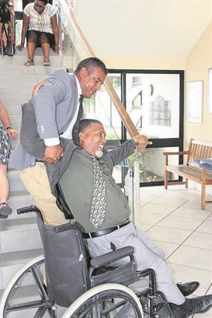 Denzil Jacobs, TWK’s first and only disabled councillor. Behind him are Bernold Benson (right), his personal assistant, and Municipal Manager Boy Manqoba Ngubo.
