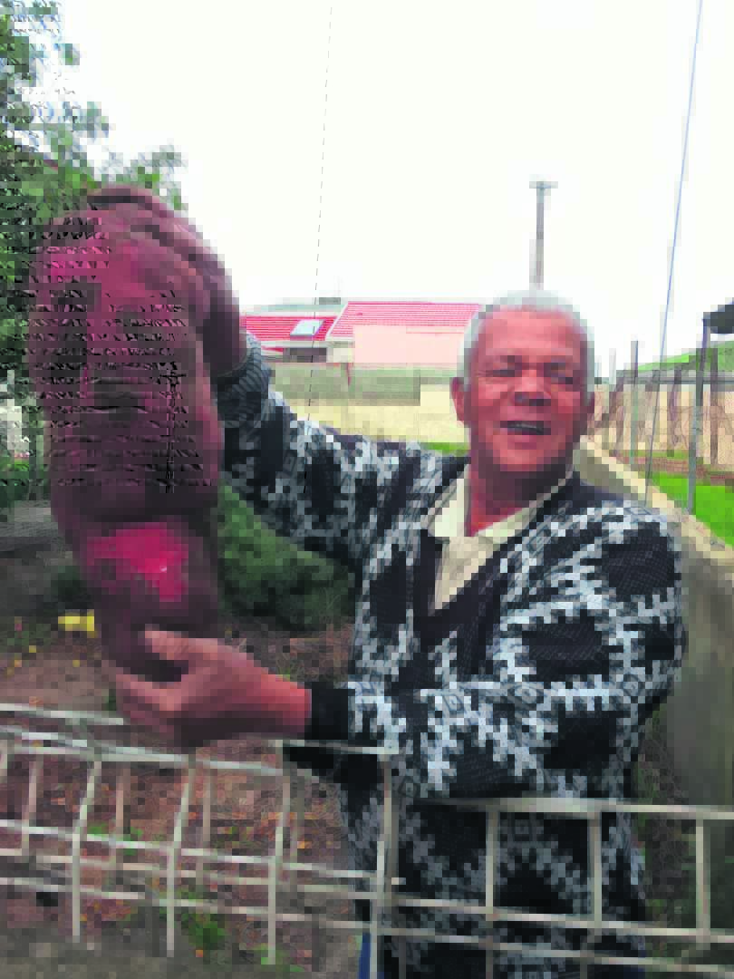 Martin Snyman van Hawston pronk by die reusepatat wat hy verlede week uit sy tuin geoes het. Snyman bemes die grond met guano. Hy is op 80-jarige ouderdom steeds baie aktief en is ’n ook ywerige tuinier wat groenbone, seldery, uie, knoffel en soetrissies in sy tuin plant.
