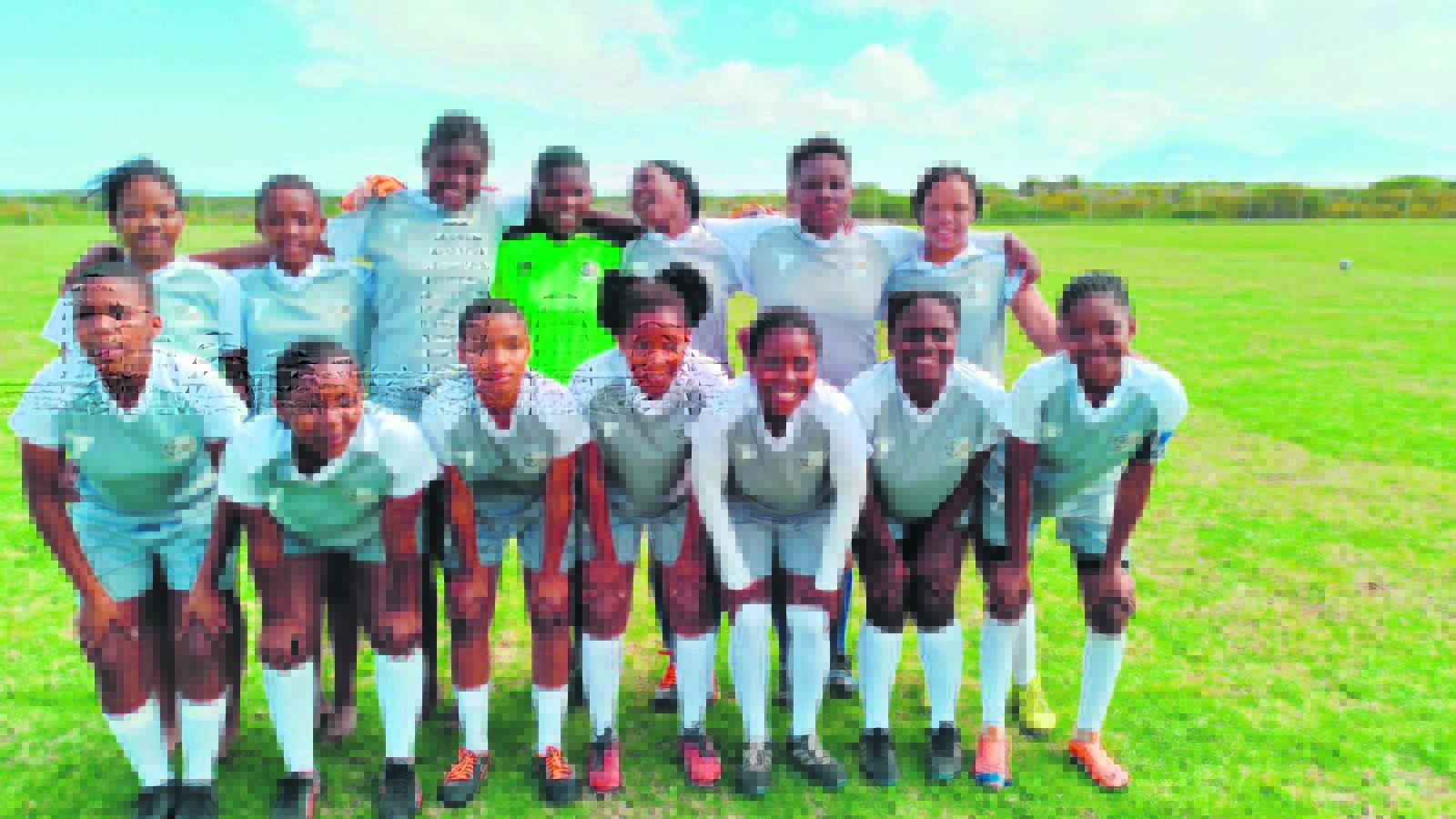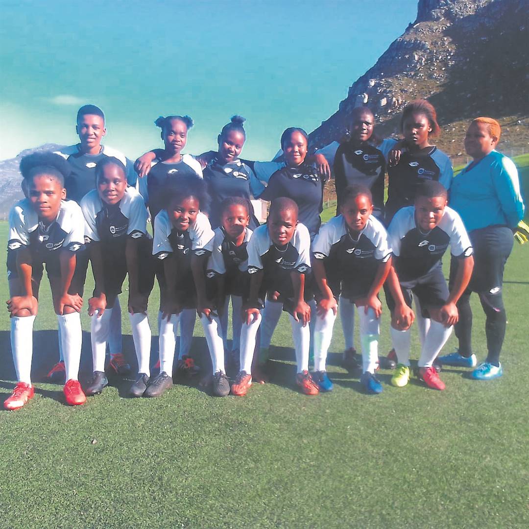 The girls of Siyadlala soccer club in Zwelihle with their coach Archie Mjakuja.