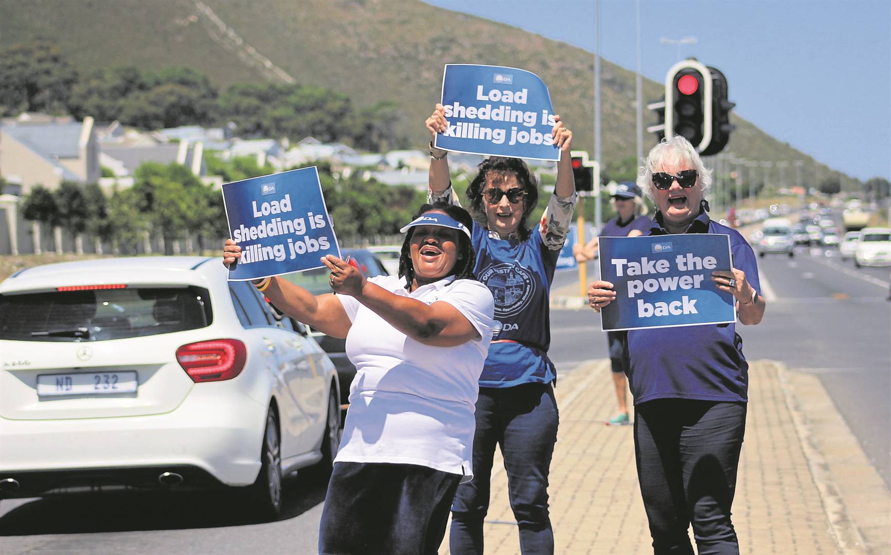 Democratic Alliance activist Hannie Morgan, Carol Carver and Overstrand Executive Mayor Dr Annelie Rabie took to the streets along with other councillors and party activists as part of a nationwide protest calling on national government to put a stop to load shedding. Groups of people armed with posters stood at various points across the Overberg, while thousands of others marched to Luthuli House in Johannesburg or the ANC’s provincial head office in Cape Town. Some of the posters read: “Power to the people”, ”Take the power back”, ”Load shedding is killing jobs” and “Enough is enough”.Photos: Bianca Du Plessis
