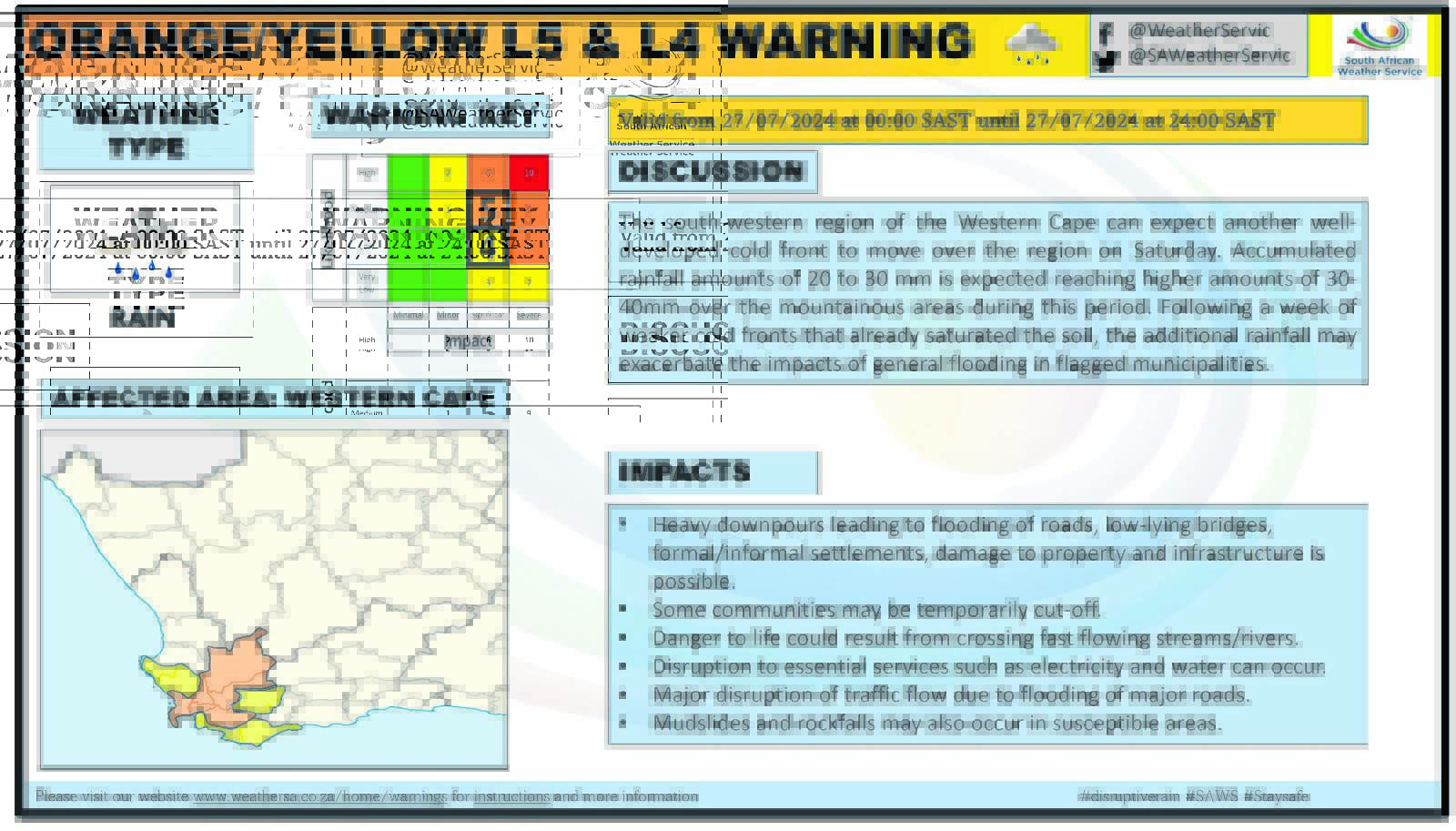 On Sunday evening a level-4 weather warning was issued and on Monday the storm warning remained active. “Residents are advised that the South African Weather Service has issued weather warnings for the Overberg Municipal area, relating to severe thunderstorms and heavy rainfall over the next two days.”