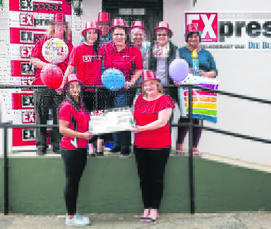 : Môre, 5 Oktober vier Mid-Karoo Express ons eerste verjaardag! Die afgelope jaar het ons elke week lekker-lees en interssante nuus vanuit ons lesersgebiede geplaas uit die pen van korrespondente wat in die onderskeie gebiede woon. Ons het ook al baie werk vir liefdadig-heid gedoen en verskeie ontbytses-sies gehou om ons lesers en adverteerders beter te leer ken. Die Mid-Karoo Express se bestuur en personeel wil vir elke persoon wat weekliks getrou ons gratis koerant lees, asook ons lojale adverteerders bedank vir hul ondersteuning in ons eerste jaar. Ons was van dag een af hartlik in jul gemeenskap verwelkom en ons glo dat ons nog ’n lang pad met almal sal stap. Hier vier van ons personeel en korrespondente ons eerste verjaardag by ons kantoor in Cradock. Agter van links is Michael Healy (IT-bestuurder), Yvette Roelofse (advertensieverteenwoordiger), Nolan Venter (korrespondent), Nicolette Thomas (bemarking), Teresa Opperman (korrespondent), Wilna de Klerk (korrespondent) en Erica Abrahams (ontvangsdame en advertensieverteenwoordiger: Cradock). Voor is Tasmia Ismail (bestuurder van EP Media en Die Burger Oos-Kaap) en Bettie Giliomee-Rossouw (streeksredakteur: EP Media). Korrespondent Nolan Venter het gewys hy is ‘n man van vele t