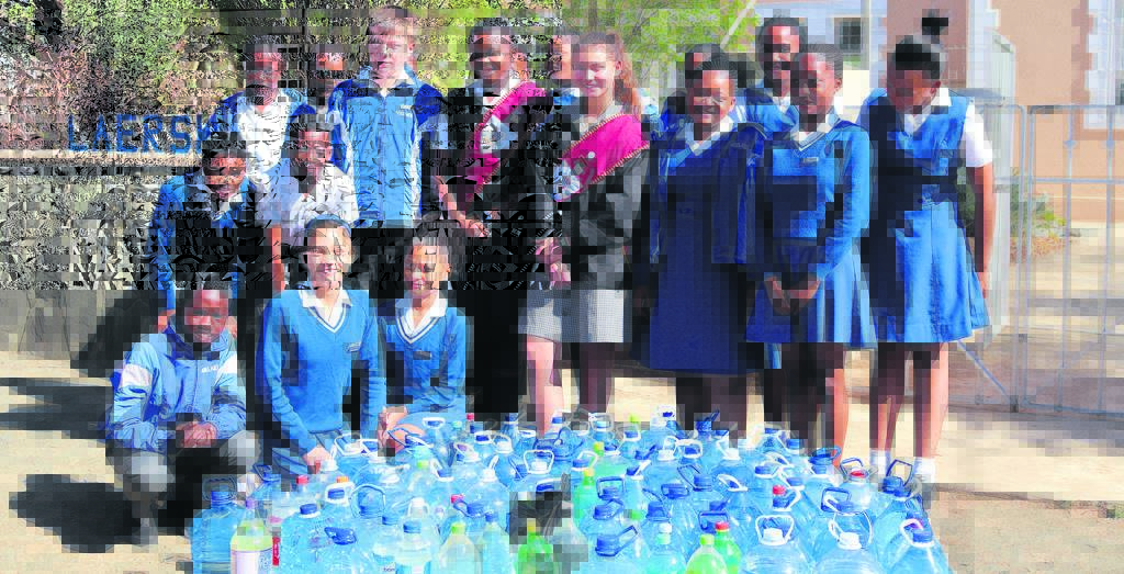 Learners from Gill Primary School in Somerset East collected water in reusable containers and donated it to residents from their drought-stricken neighbouring town, Adelaide. The bottles of water were delivered by the head prefects, Zama Nxonki and Casli Marsh. Photo:SUPPLIED