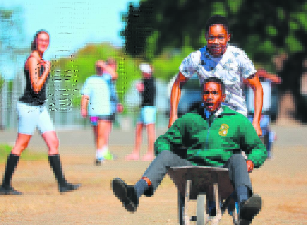 Baie oud-Middies het aangename herinneringe van Wieledag, wat die afgelope 20 jaar ’n instelling by die Hoërskool Middelburg was. Dié geleentheid, wat vanjaar deur die prefekte met groot ywer gereël is, verg dat spanne met al wat ’n wiel is om die rugbyveld kompeteer. Lees meer hieroor op bl. 4. Op die foto word Dorian Fillis deur Grethan Visagie tydens die kruiwawedren by die Wieledag gestoot. Foto: JOHANETTE PHOTOGRAPHY