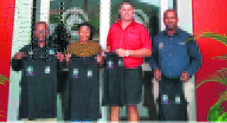 Die United Barbarians Rugby Club in Patensie spog met splinternuwe hemde geborg deur Jeffreysbaai Pick ’n Pay en Kwaggaskloof: (van links) Thembela Swepu (United Barbarians), Latoya Smith (Kwaggas-kloof), Deon van Jaarsveld (Kwaggaskloof) en Shannon Slabbert (United Barbarians). Foto:VERSKAF
