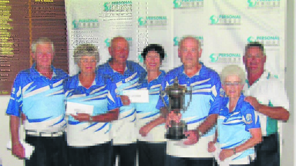 Jeffreys Bay bowlers – (from left) Prop du Plessis, Retha du Plessis, Wynand van Heerden, Jackie van Heerden, Keith Wakelin and Petro Toerien – triumphed at the recent Jeffreys Bay Bowling Club 2020 Super Sixes. Carl Vermeulen from Personal Trust (sponsor) hands over their prize. Photo:SUPPLIED