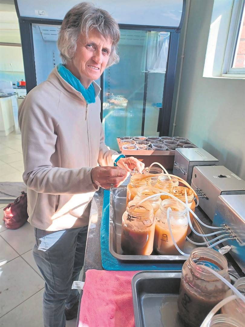In haar laboratorium, Scarab Lab, vermeerder sy die organismes wat in die veld ge-oes word.