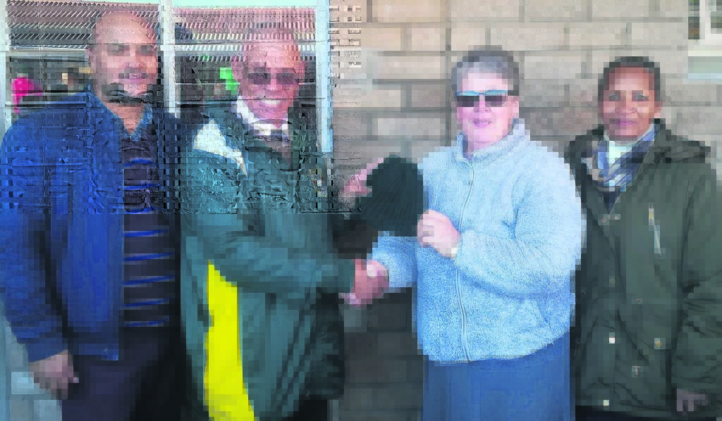 Die leerders van die Chigwell Primêre Skool in Patensie spog met knus groen mussies. Skoolhoof Peter Gert Dolph (tweede van links) ontvang die warm donasie van (van links) Tony Bergman, Martha Geldenhuys en Erica Jonas van die geestelike plaasbedieningsgroep wat die skool die afgelope jaar bedien het. Foto:VERSKAF