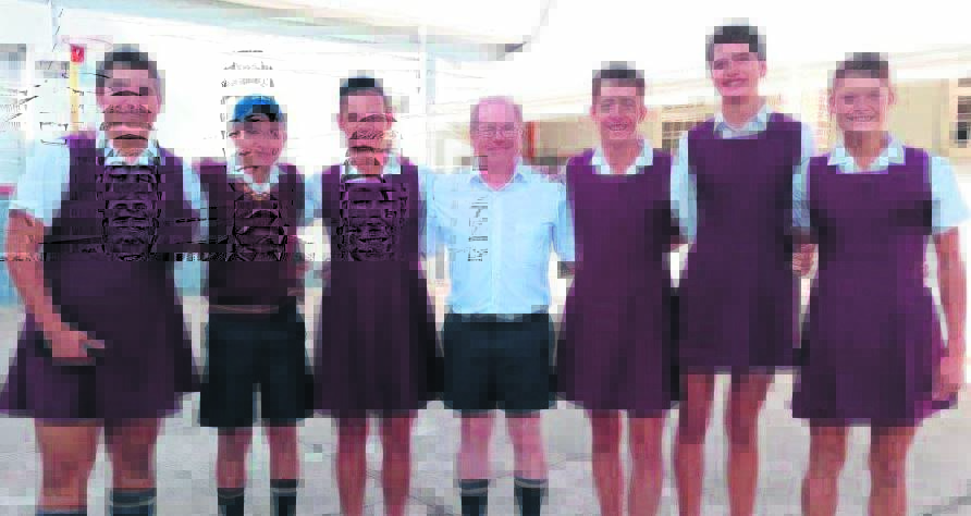 Leerders van die Hoërskool McLachlan in Joubertina het onlangs hul broeke vir rokke verruil. Die minder-brawes het hul langbroeke vir ’n kortbroeke verruil – alles om die R62-Kamerade met hul Wacky Wednesday-fondsinsameling te help. Met hul spoggerige drag is (van links) Bennie Strydom (graad 12), Uli Terblanche (graad 12), Johan Strydom (graad 11), Stan Pienaar (waarnemende skoolhoof), Nicola de Kock (graad 12), Jan-Hendrik Crous (graad 12) en Zack Strydom (graad 10). Foto: Verskaf