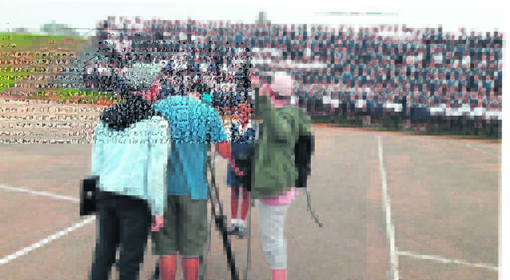 Ligte . . . kamera . . . aksie! Leerders van die Laerskool Jeffreysbaai het verlede jaar hul debuutverskyning op televisie gemaak. KykNET het die skool in 2018 besoek as deel van die verfilming van hul gewilde Skole Top 10-program. Leerders moes tien verskillende tonele doen, waarna hulle die naam van `n musiekvideo moes aankondidg. Hier is die KykNET-span met 2018 graad 7-toppresteerder Zeta Hendricks waar sy die Nr 1-musiekvideo aankondig. Die skool staan gereed om die skoollied te sing. Foto:VERSKAF
