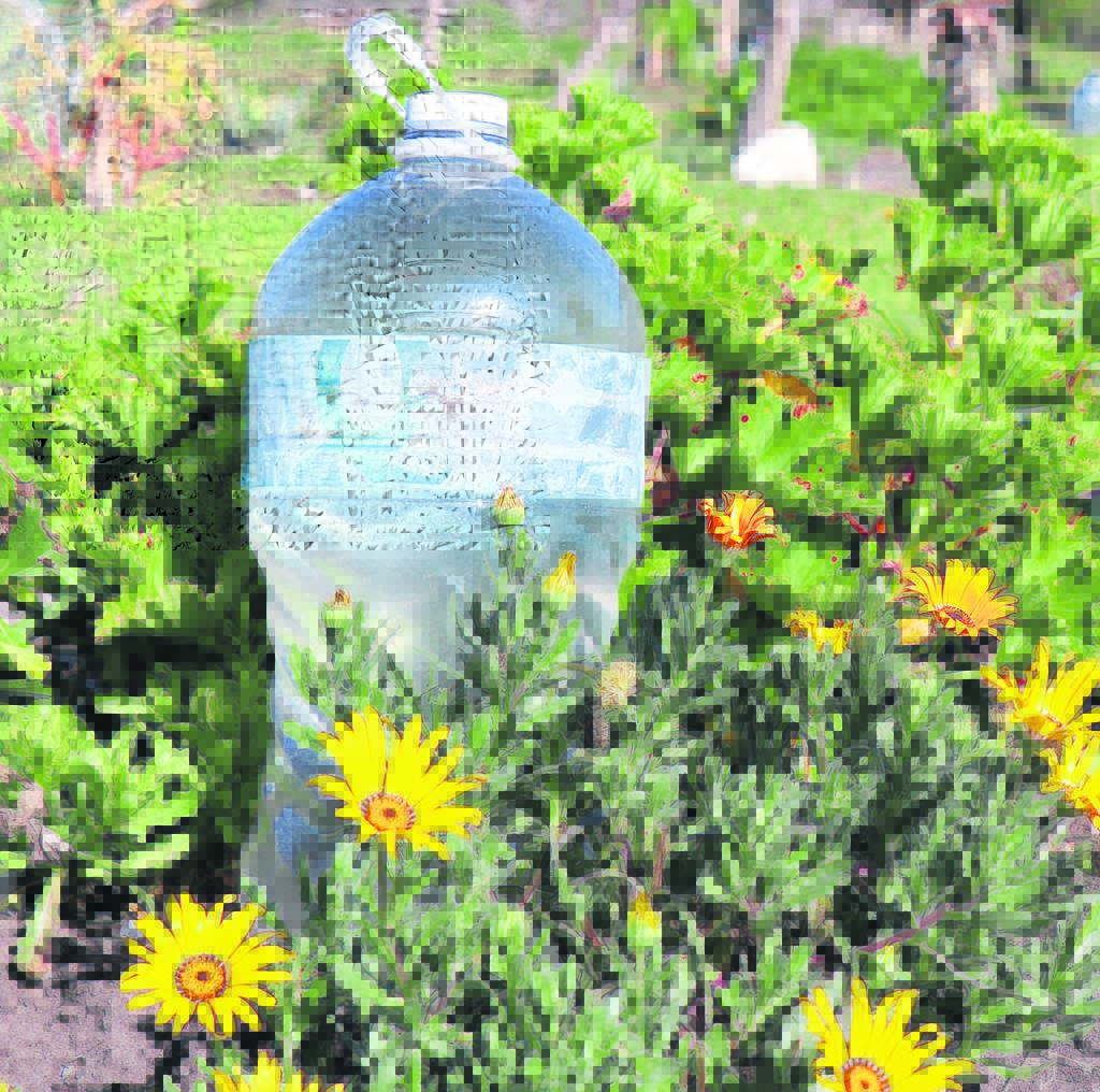 Die water word in 5l-bottels oorgegooi. Die bottels wat oral in die tuin staan, word vir die natmaak van die tuin gebruik.