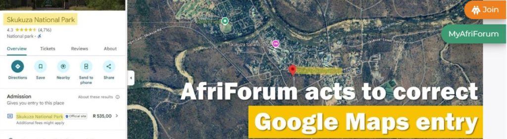 Last week, civil rights organisation AfriForum announced it would take action to correct the misleading Google Maps entry showing “Skukuza National Park.”