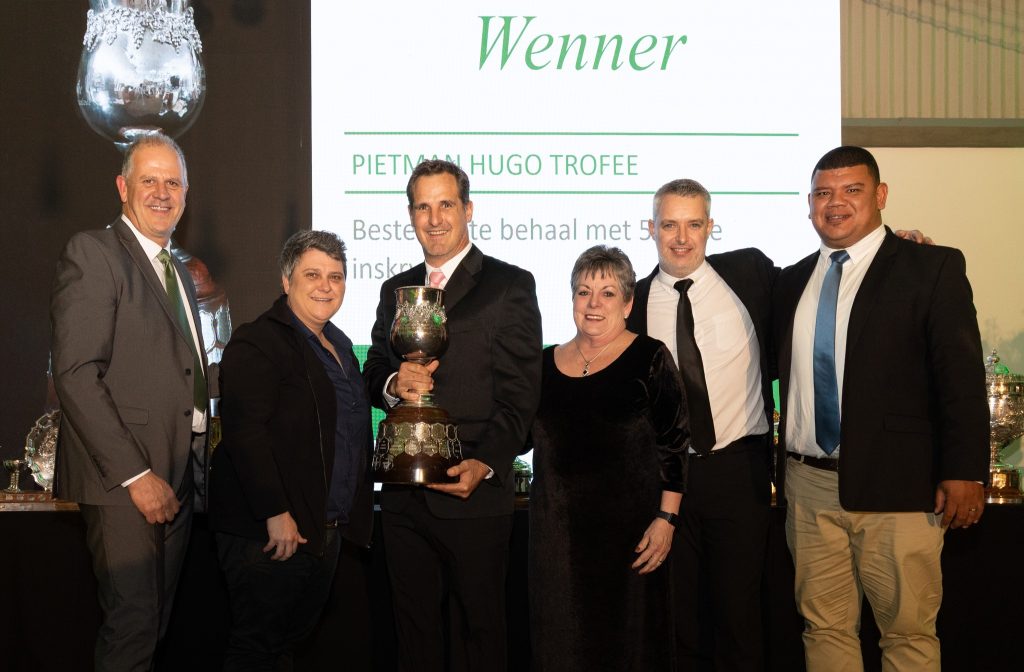 Die Pietman Hugo Trofee is vanjaar deur KWV gewen by die SA Jongwynskou. Van links is Christo Pienaar (voorsitter SA Jongwynskou), Izélle van Blerk en Justin Corrans (KWV), Elsabé Ferreira (SA Jongwynskou), Kobus van der Merwe (KWV) en Breyton Milford (algemene bestuurder Agri-Expo).