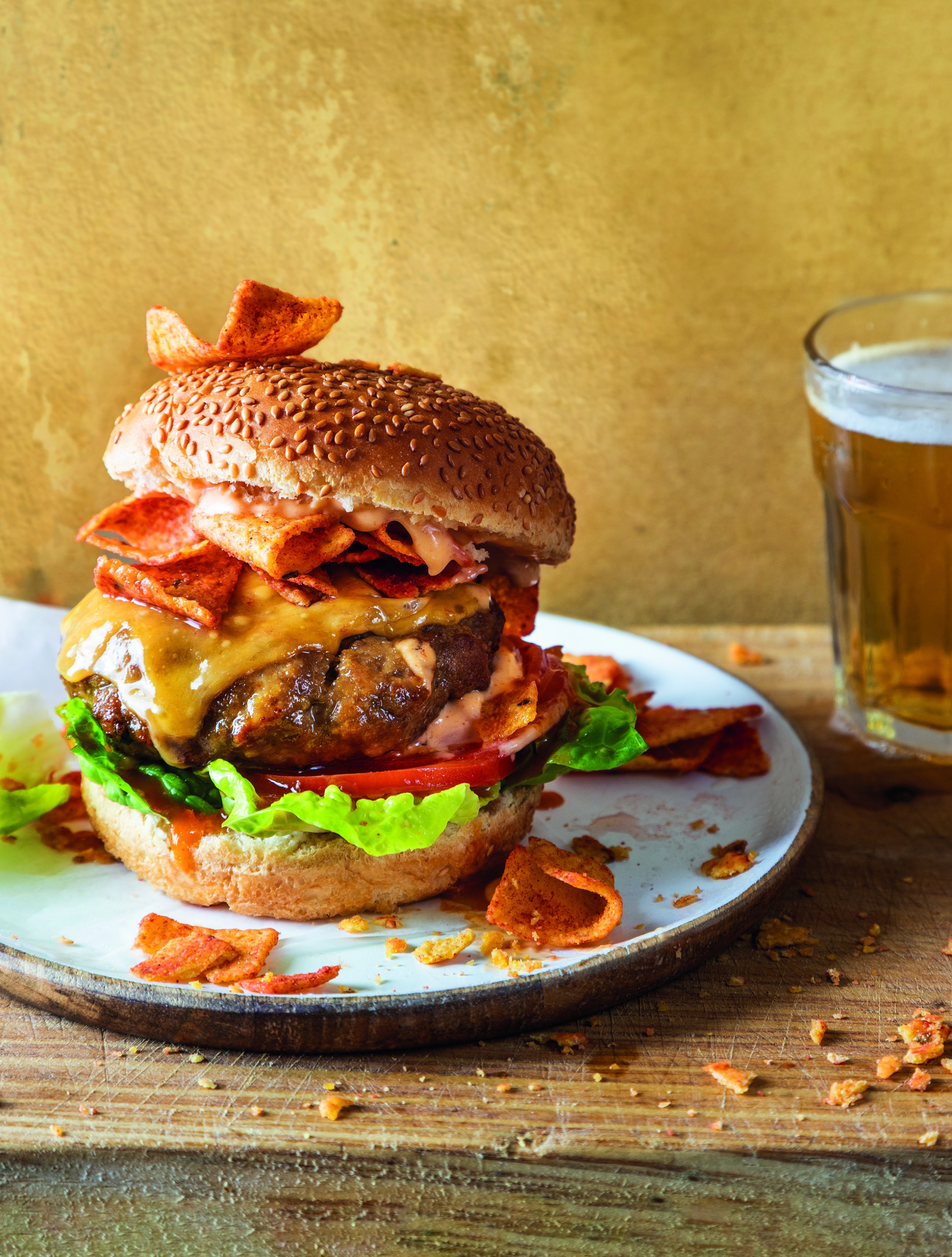 3 Split the burger rolls and spread the top halves with mayonnaise and the bottom halves with the remaining monkey gland sauce, lettuce, tomato and onion. Add the burger patties and top with a handful of chips and the top half of the rolls. Serve immediately.