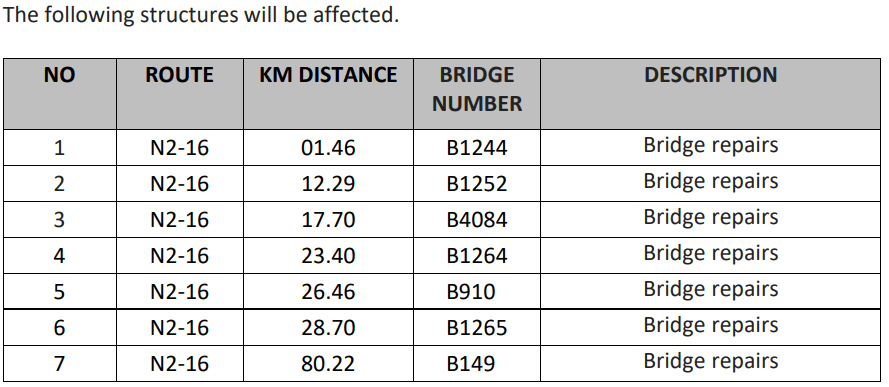 SANRAL’s Acting Eastern Cape Provincial Head, Kayakazi Mafuta said, said to undertake the required bridge and culvert repairs, road users approaching the affected structures along the N2 will be restricted to a reduced road width with delineators, warning signs and flagmen.