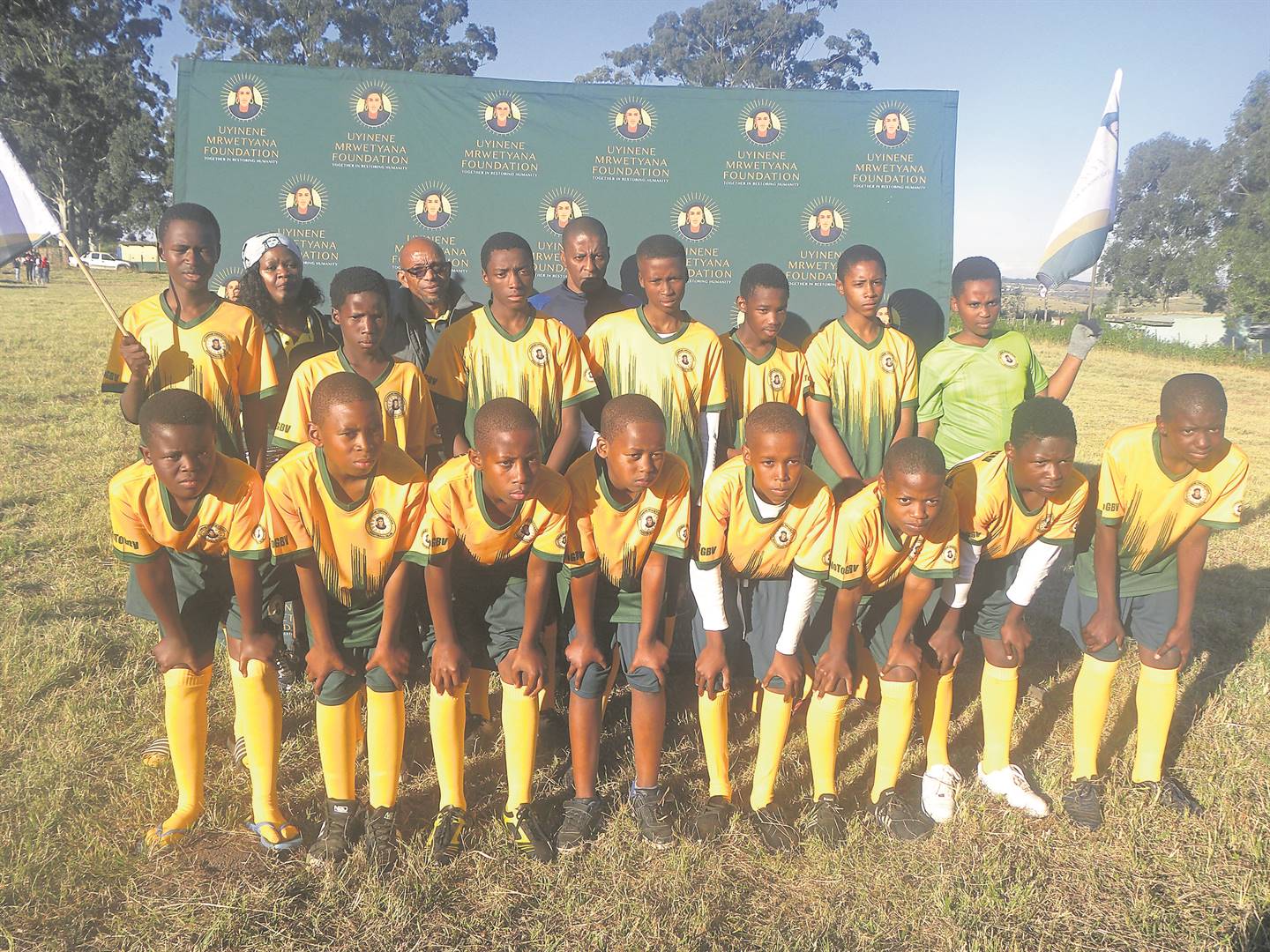 Uyinene Mrwetyana Football Club u/15 team wearing their brand kit standing with the parents of Uyinene Mrwetyana, Noma (mother), Philip (father) and former Bafana Bafana player, Sibusiso Zuma in Centane.