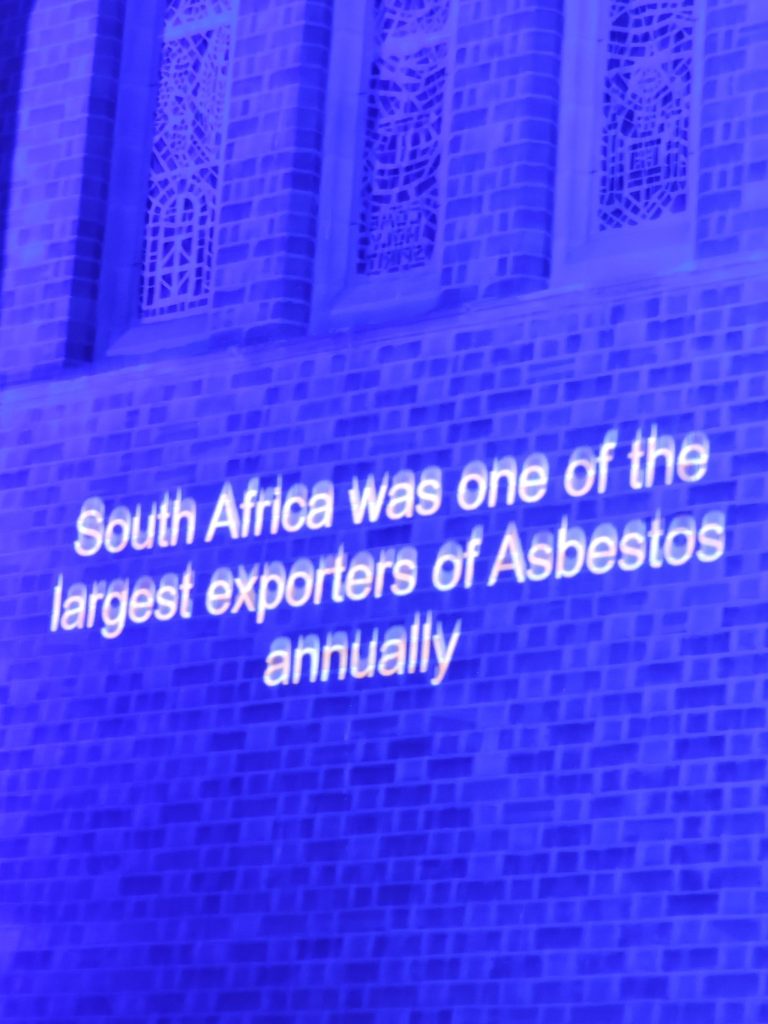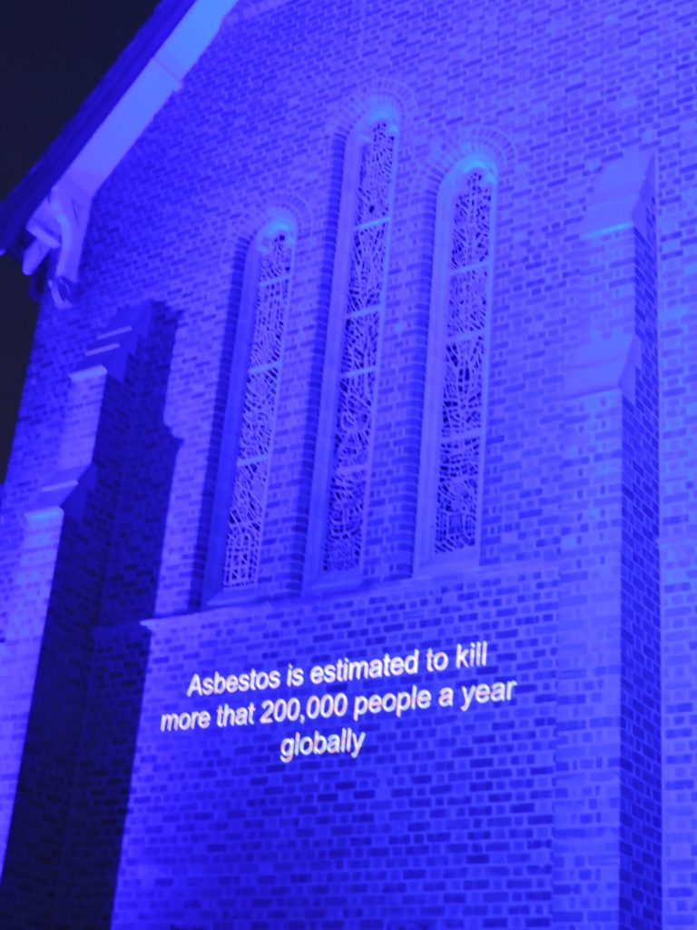 “Daar is nooit enige veilige vlak vir blootstelling aan asbes nie,” sê Tracey Wood van die Glynnis Gale-stigting. Sy en Paul Wood van Enviro Investigations het die simboliese verligting van die katedraal gelei. Op dié dag is Aksie Mesotelioomdag in verskeie ander lande oor die wêreld heen herdenk vir slagoffers van mesotelioom en asbesverwante siektes, en om bewustheid hieroor te skep. Mesotelioom is ‘n seldsame en aggressiewe kanker veroorsaak deur die inaseming van asbesvesels.