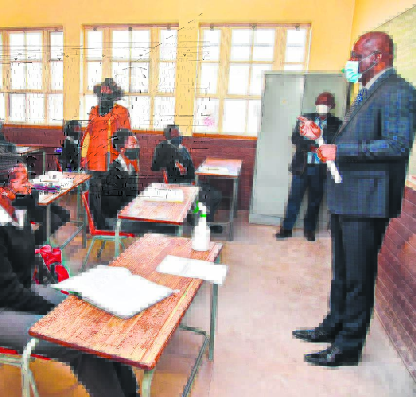 Terwyl duisende leerlinge Maandag na skole in die Noord-Kaap teruggekeer het, het die getal bevestigde koronavirusgevalle in die provinsie toe tot 9 129 gestyg. Dit was ’n styging van 2 000 gevalle oor die vorige tien dae. Die Covid-19-sterftesyfer het in dieselfde tydperk van 76 tot 106 gestyg. Geoffrey van der Merwe, woordvoerder van die Noord-Kaapse onderwysdepartement, sê geen ernstige voorvalle is Maandag aangemeld nie. Dr. Zamani Saul, premier van die Noord-Kaap, het Maandagoggend die Gekombineerde Skool Noupoort besoek. Foto: Verskaf