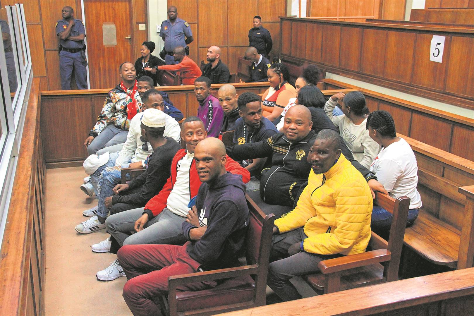 Die 21 beskuldigdes word van 56 bendeverwante en ander aanklagte wat moord, poging tot moord, ontvoering en bedrog insluit, aangekla. Die saak, wat na verwagting na die hooggeregshof oorgeplaas sal word, word deur die staat en verdediging as ingewikkeld bestempel.