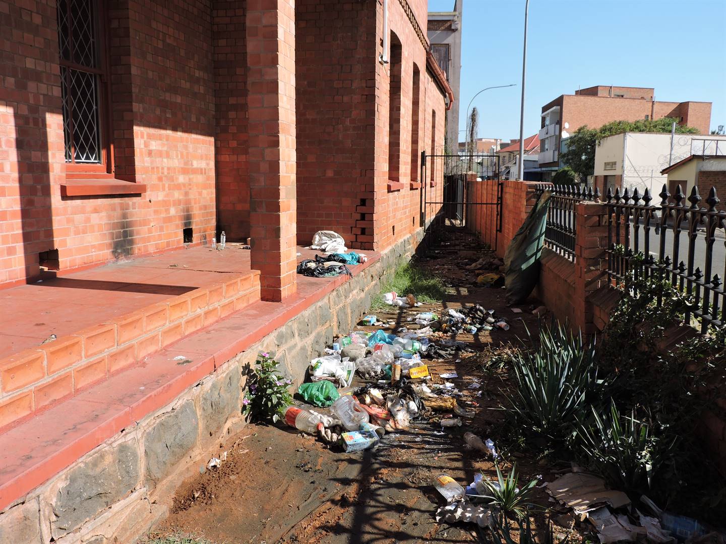 Die voorkant van die pastorie is deur ’n lae heining omring, en met die teenwoordigheid van leë drankbottels en ander rommel, is dit duidelik dat die heining of stoep gereeld deur haweloses as slaapplek of beskutting gebruik word.