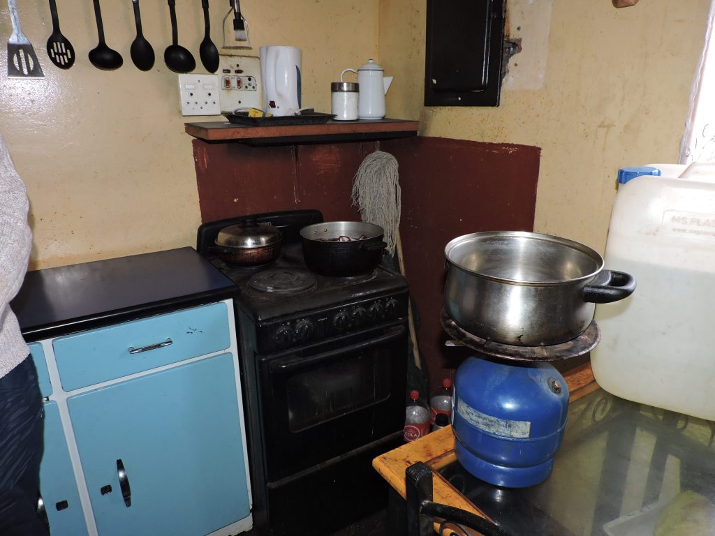 Hy gebruik ‘n gasstofie om kos mee te maak, en wanneer hy sy elektriese naaimasjien moet gebruik om ander se klere teen betaling te verstel, of selfs gordyne te maak, moet hy by bure aanklop om by hulle elektrisiteit te gebruik.