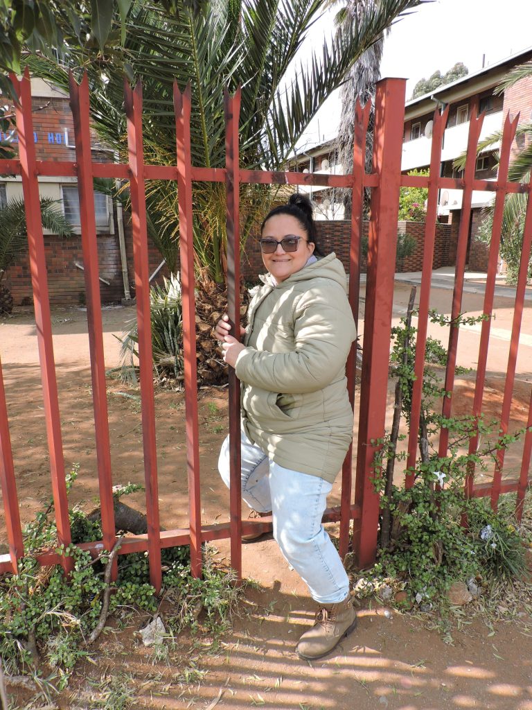Links: Marlize Delarey, sekretaresse van die Community Alliance South Africa (Casa) wys waar inwoners van Holland-hof deur die heining moet klim omdat die voetgangerhek vasgesweis is. Holland-hof in New Park is die enigste woonstelkompleks wat NoordkaapBulletin besoek het waar die sekuriteitsheining nog bestaan. By die ander wat besoek is, is daar net dele van heinings oor. Regs: Inwoners van ‘n woonstel in Holland-hof leef al sedert 2018 sonder ‘n voordeur. Op navrae sรช ‘n munisipale amptenaar voortdurend dat hulle op pad is met die deur.