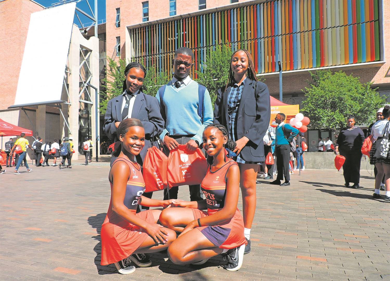 The Sol Plaatje University (SPU) in Kimberley hosted an open day on Saturday, 6 April, through which learners could explore academic offerings and learn more about campus life. From the left are, front: first-year students and cheerleaders Masego Tshilo (Heritage Studies) and Olorato April (Retail in Business Management)