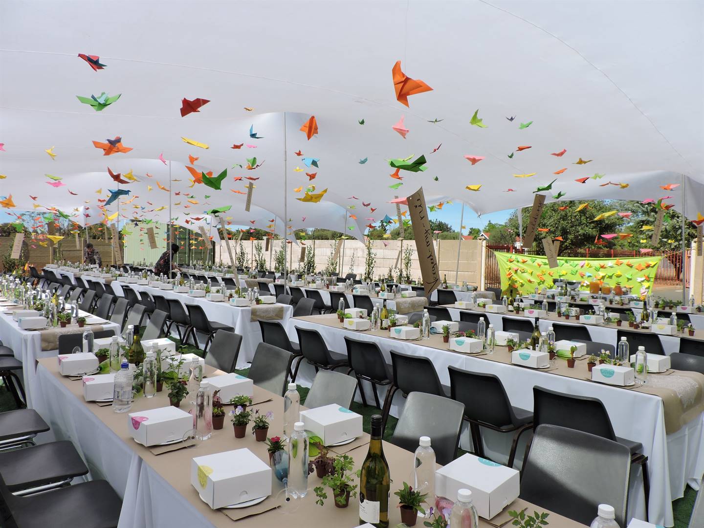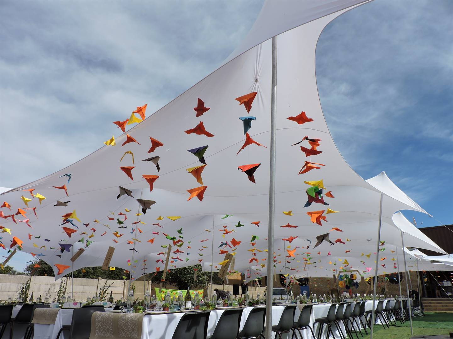 Onder ’n koepeltentafdak, met honderde gekleurde papiervoëls van origami – ’n Japanese papiervoukuns – het Murray onder meer die Afrikaanse vertaling van Jenny Joseph se mees bekende gedig, “Warning” voorgelees.