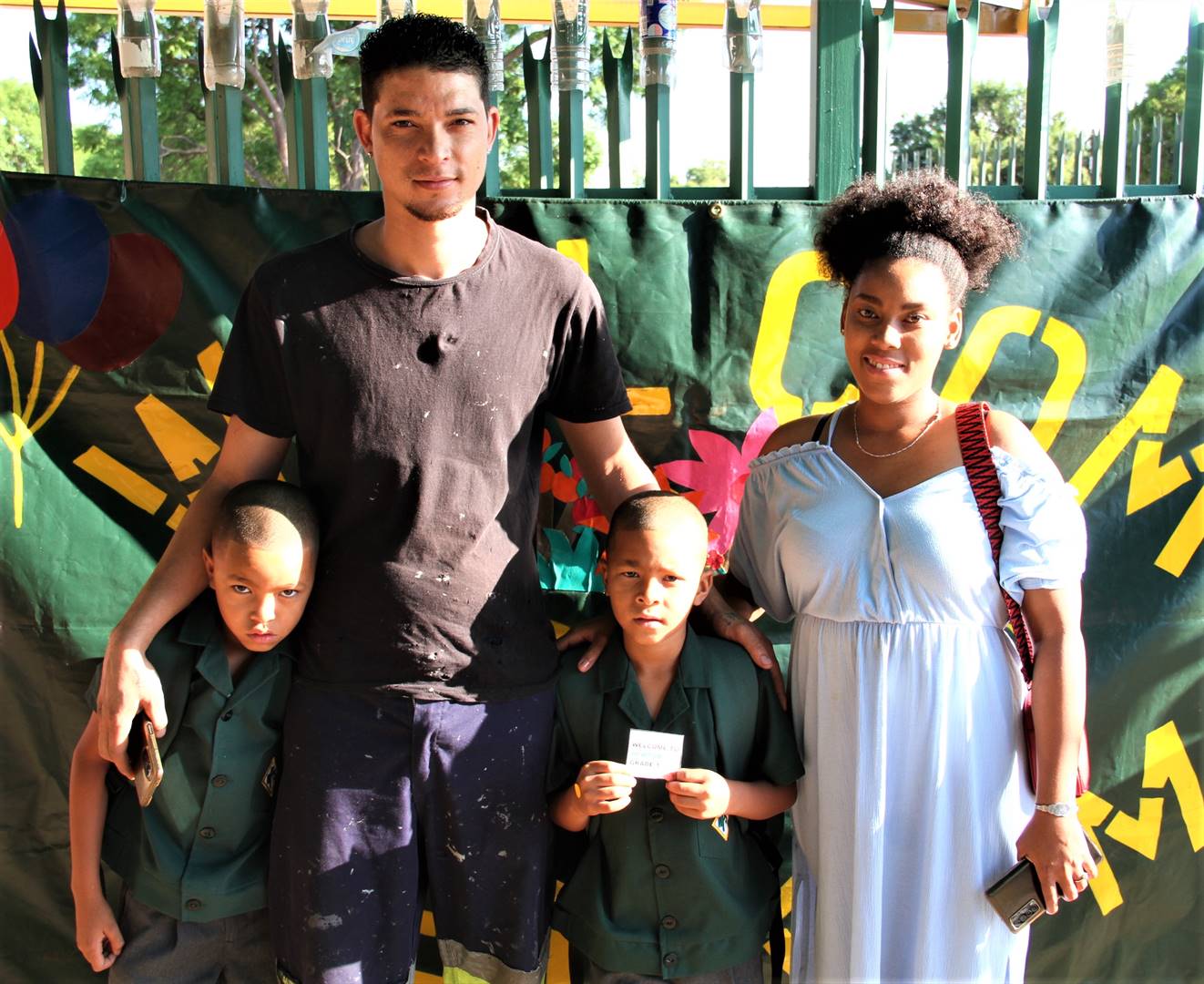 Julianno Nagel staan by sy pa, Shaydon Bartlett, en boetie, Matthew Nagel, wat vanjaar in gr. 1 by die Laerskool Newton in Kimberley begin, terwyl ma, Jessie Nagel, hom moed inpraat.