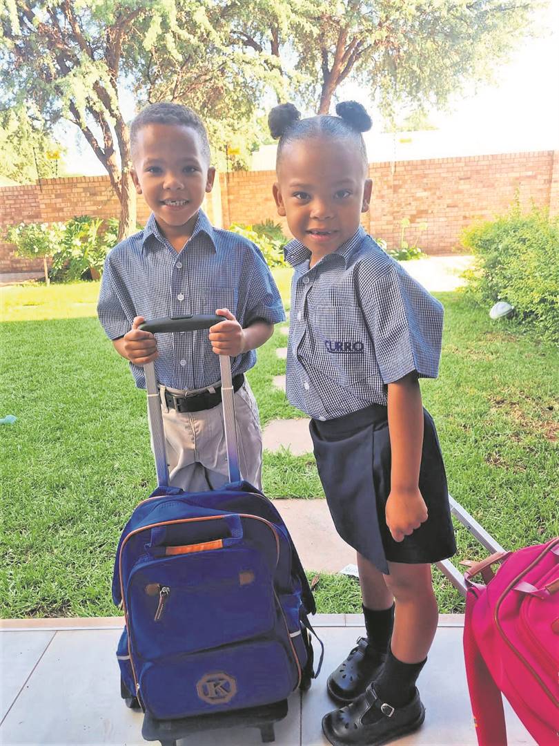 Die tweeling Aiden en Abigail Snyders, wat vir hul eerste skooldag by die private skool Curro Kathu aangemeld het, se ma, Mila, sê sy stres oor die dubbele huiswerk wat vir haar wag.