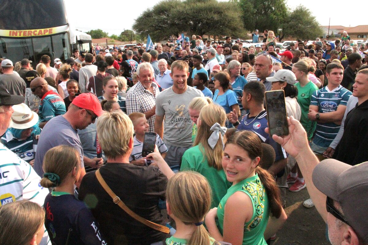 Kaptein Cebo Dlamini het met die reuse Curriebeker in sy arms gevou eerste uit die bus gespring, gevolg deur sy medespelers. Ondersteuners het om die bus gekloek om selfoonfoto’s en selfies te neem en handtekeninge veral van George Whitehead te bedel. Hy het Saterdag die strafskop in die doodsoomblik van die wedstryd oor die pale geklits om die wedstryd met 27–25 teen die Leeus in Ellispark te beklink.