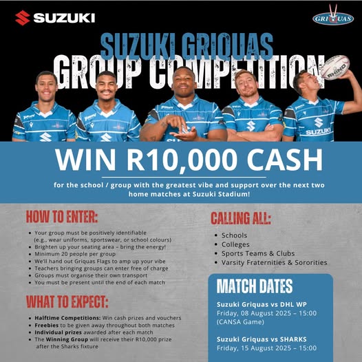 - Kyk ook uit vir die groepkompetisie waarin R10 000 kontant op die spel is vir die groep of skool met die beste gees en ondersteuning in die volgende twee tuiswedstryde. Nรก Vrydag se wedstryd, is die volgende tuiswedstryd op Vrydag 15 Augustus teen die Haaie.