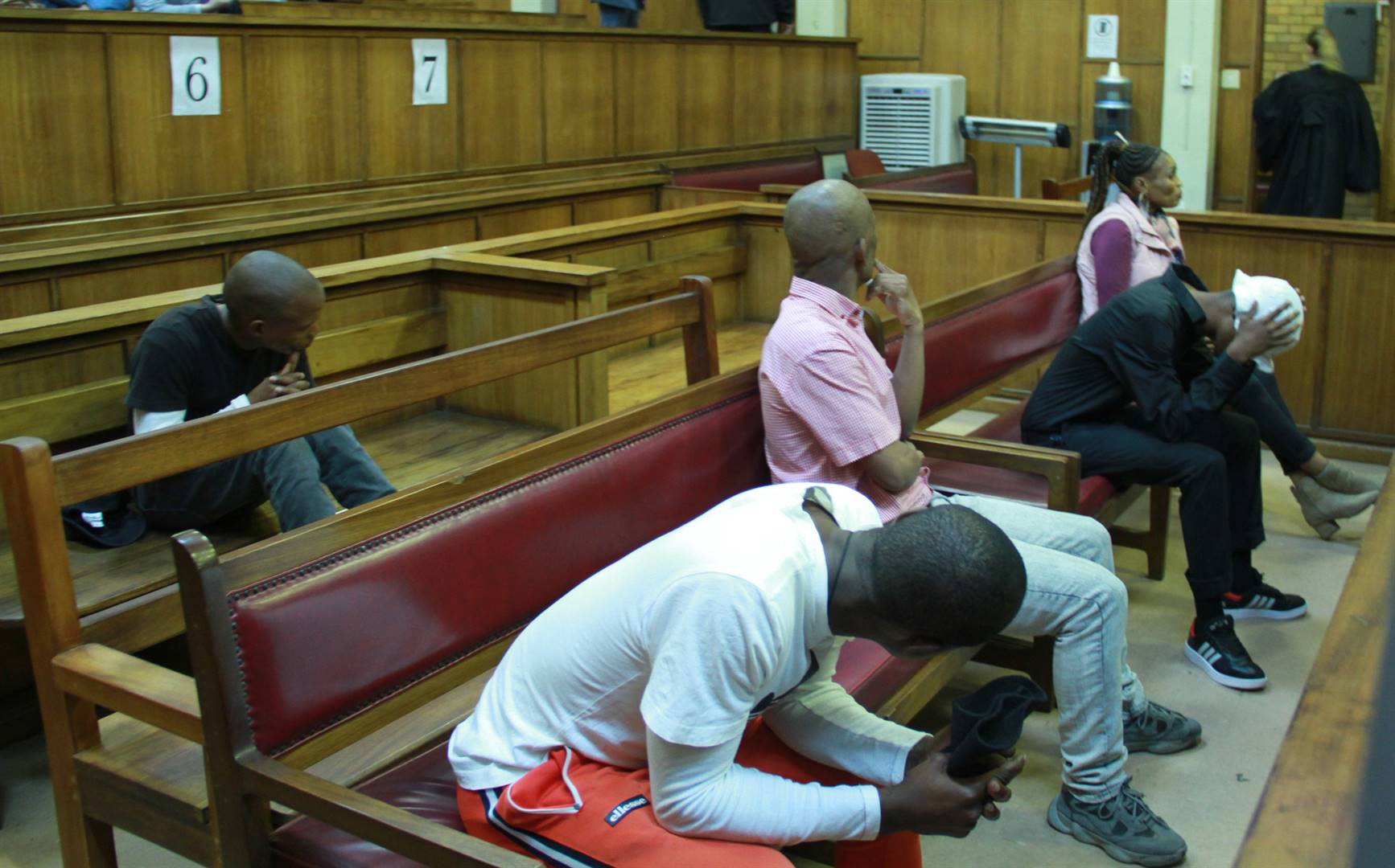Die beskuldigdes is almal van buurtes van Taung afkomstig. Donald Seoleseng (21) en Tshepo Visagie (36), albei van Majaneng; Kgomotso Mpulwana (43) van Rooivaal; en Tsepaone Melato (20) van Pudimoe, word aangekla van drie aanklagte van moord, roof met verswarende omstandighede, drie aanklagte van ontvoering en drie aanklagte van regsverydeling. Seoleseng word ook van ontsnapping aangekla.