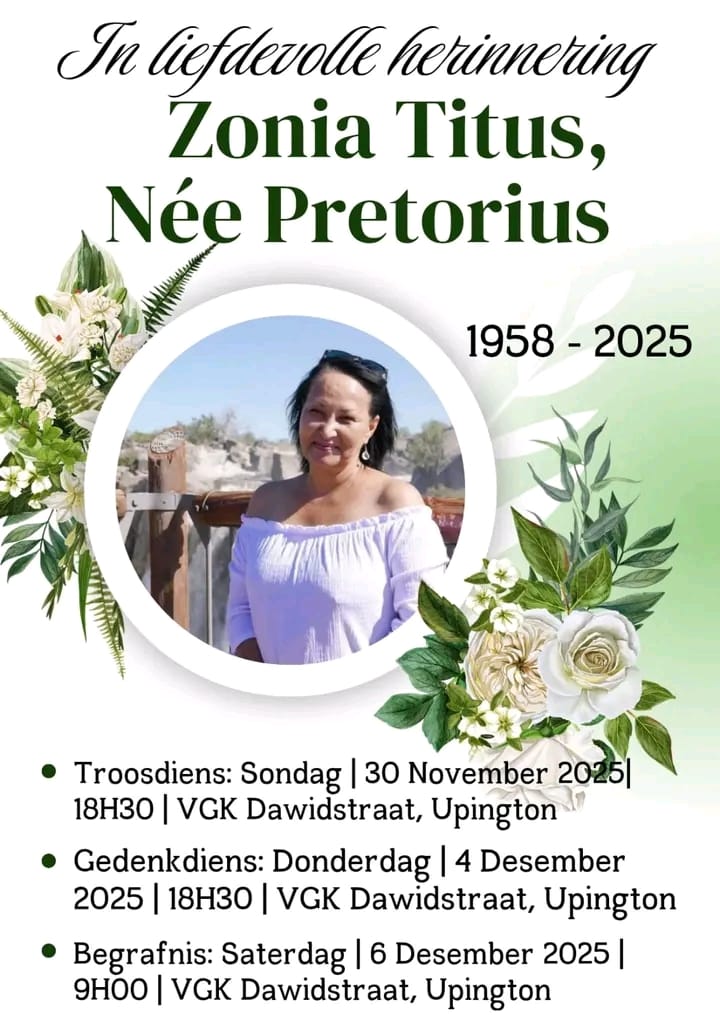 ‘n Welbekende en geliefde inwoner van Upington, Zonia Titus (67), se begrafnisdiens vind op Saterdag 6 Desember vanuit die Verenigende Gereformeerde Kerk (VGK) in Dawidstraat plaas.