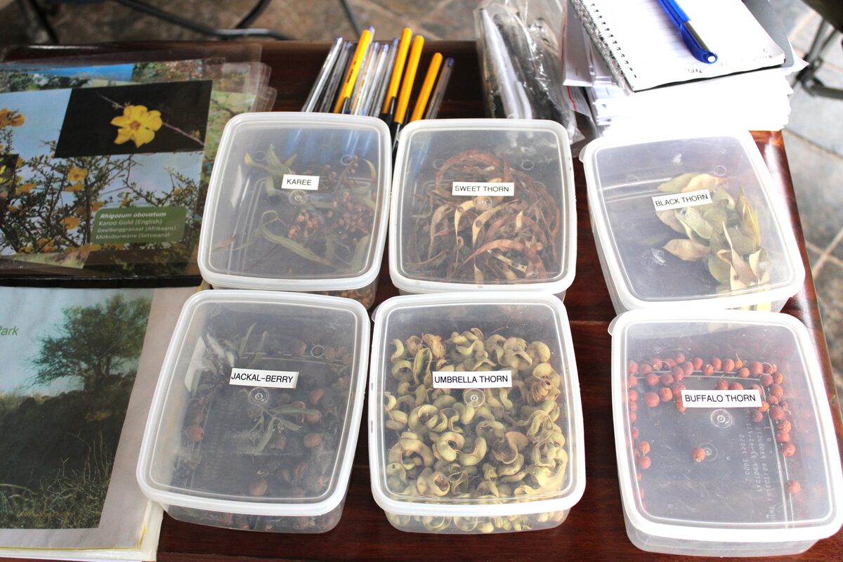 Meanwhile, Pieter and Miguel were stationed at the Matopi Picnic Site, whilst Mathilda and Hestia hosted activities at Mosu Rest Camp. There, visitors embarked on a tree-identification challenge, trying to spot all the tagged trees, with help of information about Mokala’s flora and seed samples.