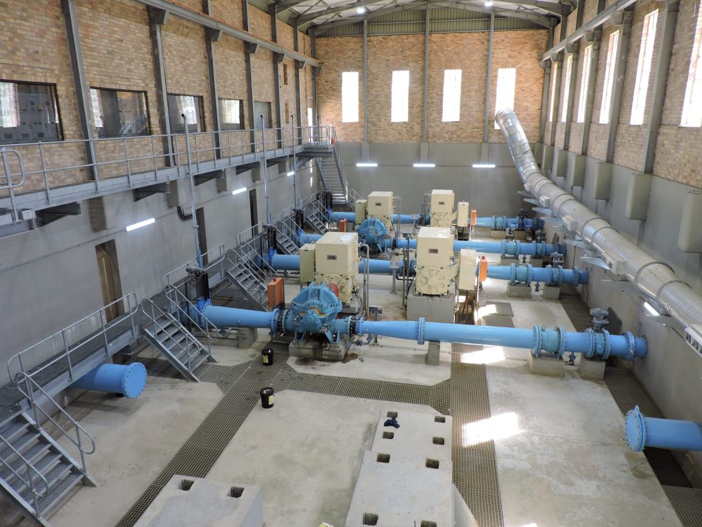 A high-lift pump station next to the old plant, which pumps water into the bulk supply system, was built around 2018 and is state of the art. However, the power supply to this pump station was never sufficient, and upgrading to bulk power supply will be done. At the time of the media visit, the pump station was operating on half capacity.