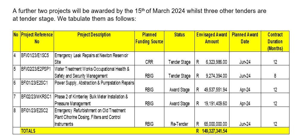 A screenshot from the media statement of the Sol Plaatje Municipality on 6 March, providing more detail on five more projects of which two will be awarded on Friday, 15 March. Photo: Screenshot